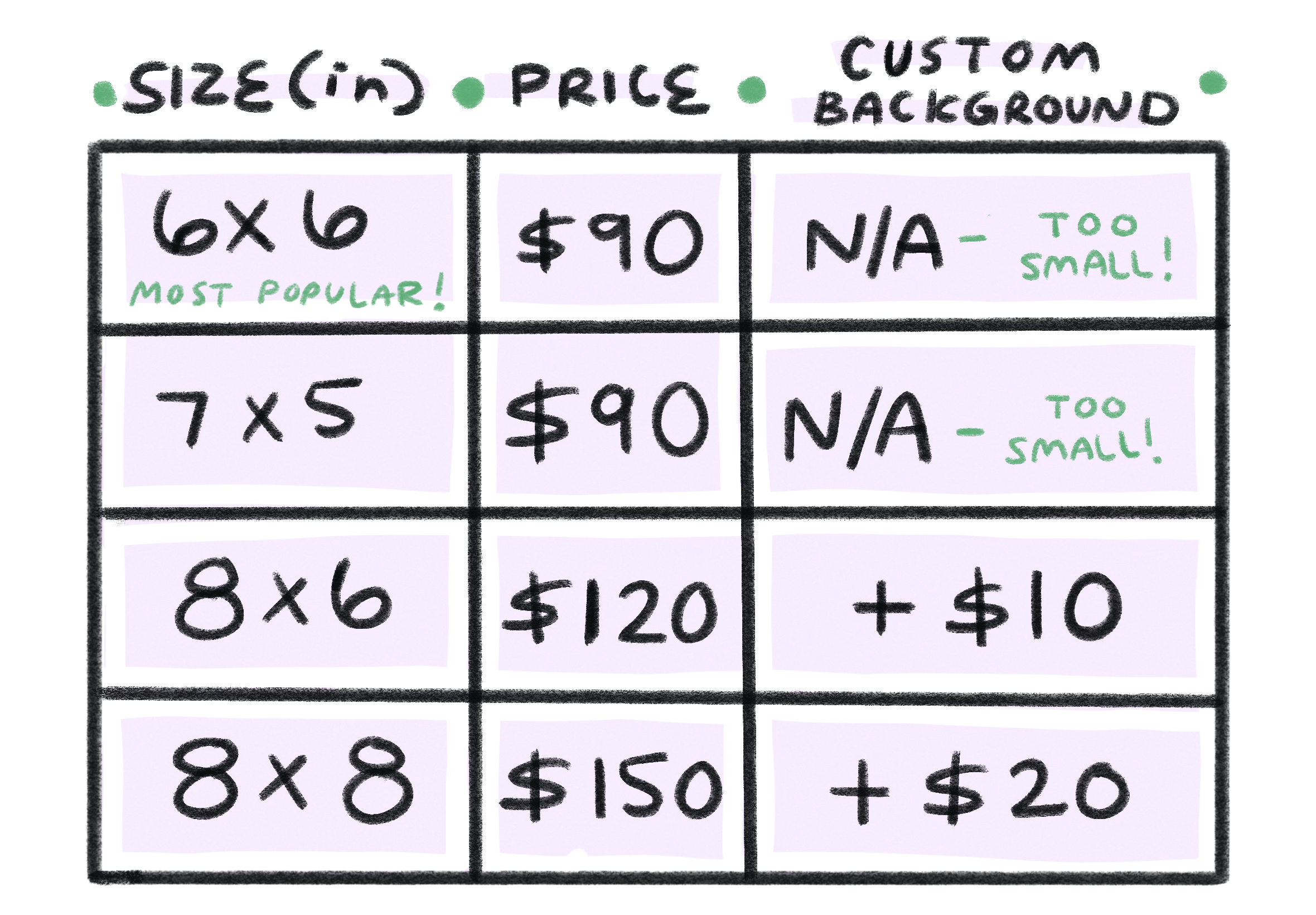 This chart shows sizing and pricing for paintings. Email me for information on larger sizes.