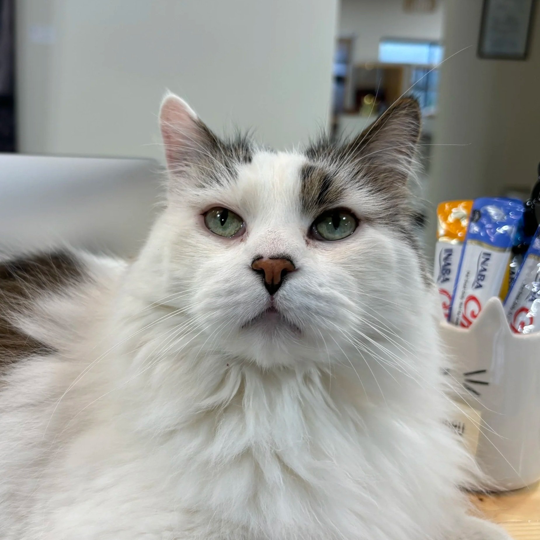 Use a favorite toy or a yummy treat to keep your pet distracted while you take the photo. This will help keep them sat in the position you want and will make sure that they’re looking at the camera and their eyes are visible.